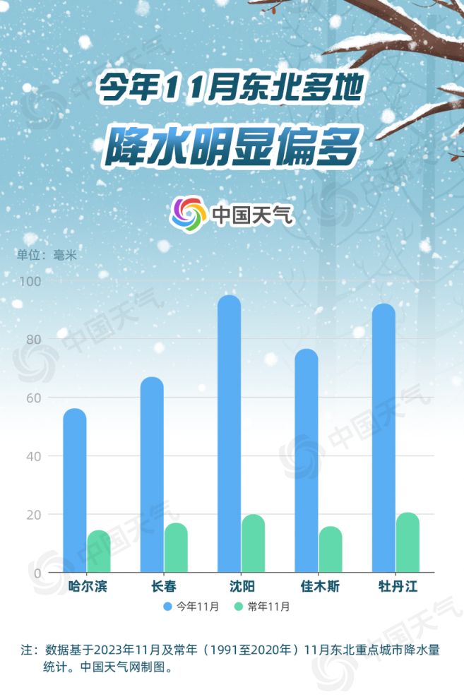 频繁雨雪导致降水严重超标,降雪日数也明显偏多。从中国天气网统计的气象数据来看,今年11月东北大部累计降水量为常年同期2倍以上,三个省会城市哈尔滨、长春、沈阳累计降水量均为1951年以来同期最多。同时,降雪日数也比常年偏多,哈尔滨、长春、沈阳11月降雪日数均超过10天,黑龙江宁安、集贤降雪日数甚至接近20天,比当地常年偏多10余天。