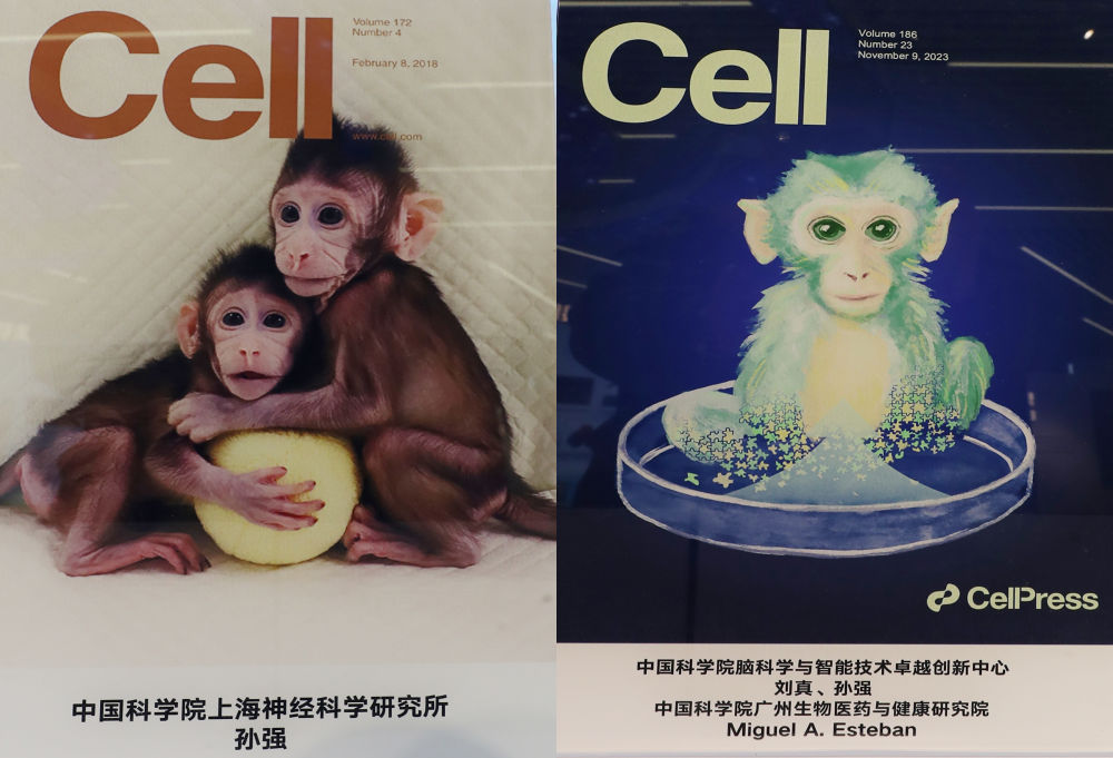 拼版照片是2023年11月29日在上海科技创新成果展上拍摄的杂志封面,左为《细胞》封面的克隆猴“中中”和“华华”,右为《细胞》封面的一只来自中国的“嵌合猴”。新华社记者 方喆 摄