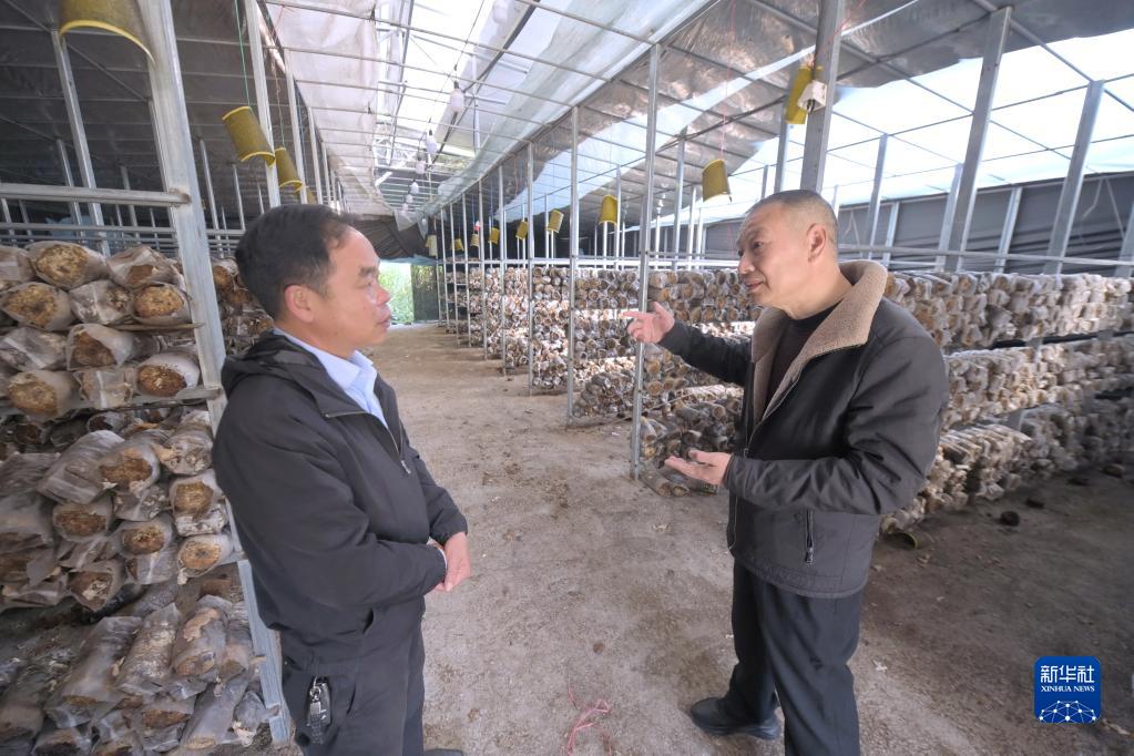 12月8日,乡村振兴特聘指导员周秦福(右)与赤溪村党总支书记吴贻国商讨对村里的菌菇房设备进行升级改造事宜。