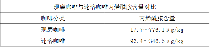 而速溶咖啡为咖啡豆烘焙、研磨、萃取后,进行适当浓缩,再通过喷雾干燥或冷冻干燥得到速溶咖啡粉。速溶咖啡的香气与风味都比不上现磨咖啡,并且预干燥、喷雾干燥等环节会导致一部分丙烯酰胺的挥发,所以速溶咖啡的丙烯酰胺含量一般低于现磨咖啡。