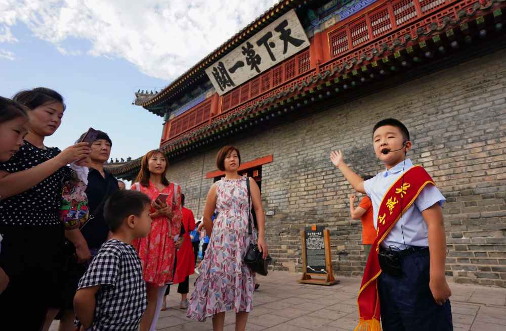 秦皇岛市山海关区“关城小导游”社会实践班的小导游(右一)在天下第一关城楼为游客讲解(2019年8月22日摄)。新华社记者 杨世尧 摄