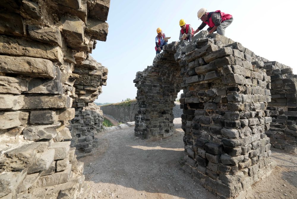 2023年6月15日,工人在山海关长城修缮工地施工。新华社记者 杨世尧 摄