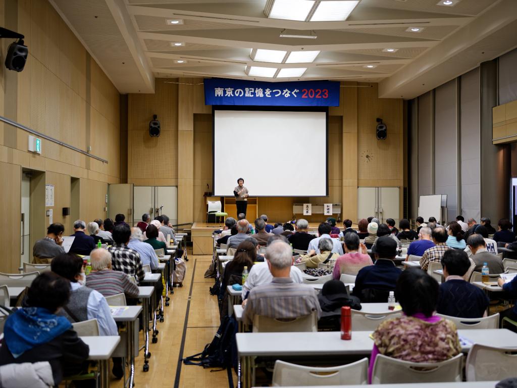 2023年12月9日,在日本大阪,“延续南京记忆会”创始人、日本铭心会会长松冈环发表演讲。新华社记者张笑宇 摄