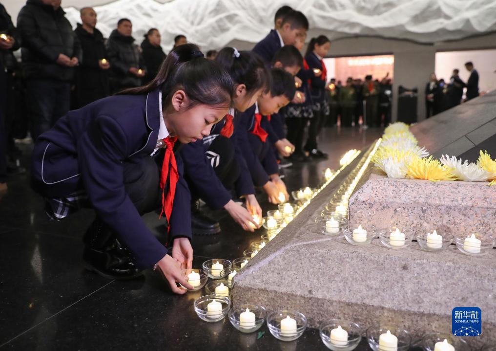 12月13日,学生代表在沈阳“九一八”历史博物馆向卧碑敬献蜡烛。新华社记者 龙雷 摄