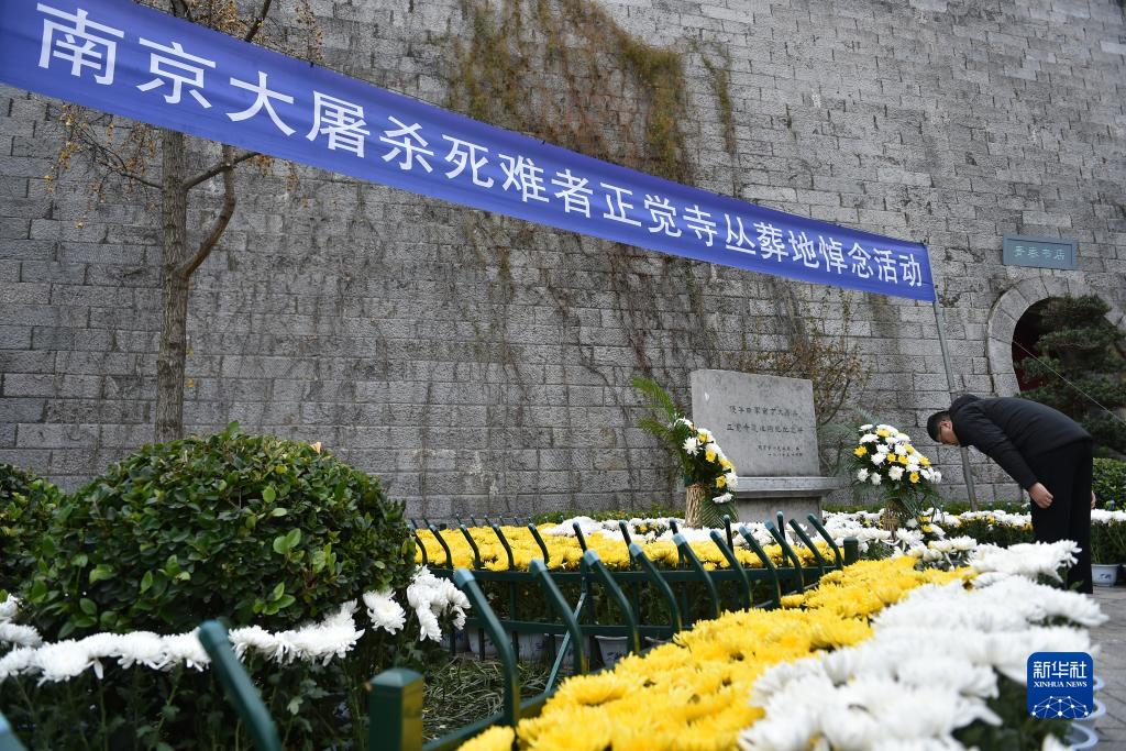 12月13日,在江苏南京,人们在侵华日军南京大屠杀死难同胞丛葬地(正觉寺)参加悼念活动。新华社发(方东旭摄)