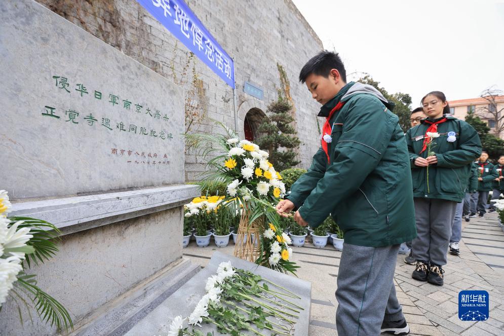 12月13日,在江苏南京,学生在侵华日军南京大屠杀死难同胞丛葬地(正觉寺)参加悼念活动。新华社发(苏阳摄)
