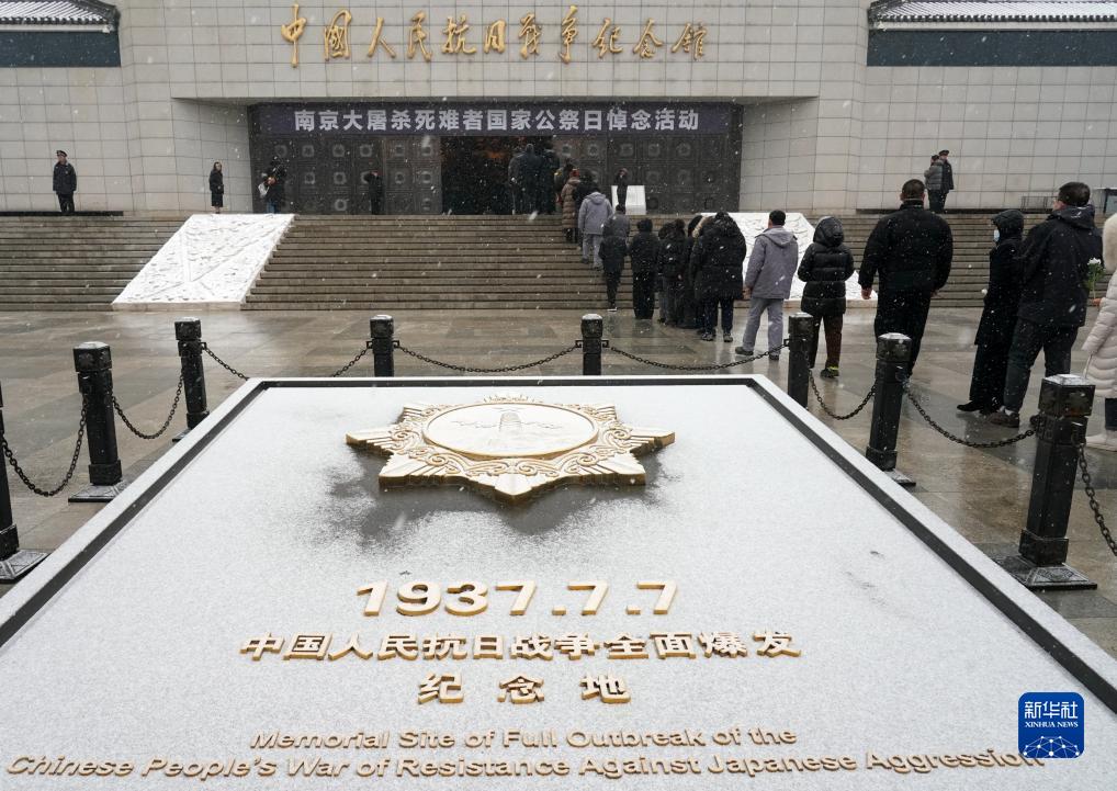在北京丰台区,纷纷扬扬的雪花从空中飘落。上午10时,中国人民抗日战争纪念馆前的广场上,身着深色服装的人们神情严肃,手中的菊花在风中微微颤动。当雄壮的国歌声响起,人们齐声高唱;国歌声毕,人们低首肃立。