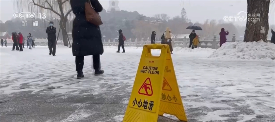 北海公园信息传媒科副科长 张磊:主要是在门区、洗手间以及重点的景区,同时我们也设置了“小心地滑”的这种提示牌130余处,此次降雪时间由于比较长,公园也采用了“机械+人工扫雪”的这种方式,争取做到了随扫随清,保证主路的畅通。