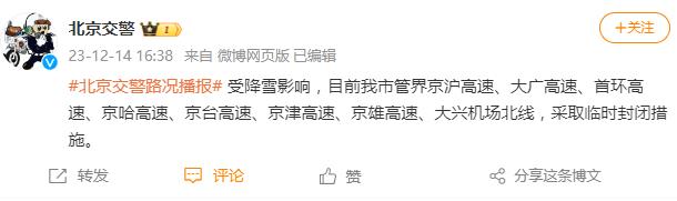 央视网消息:据@北京交警 微博12月14日消息,受降雪影响,目前北京市管界京沪高速、大广高速、首环高速、京台高速、京津高速、京雄高速、大兴机场北线,采取临时封闭措施。