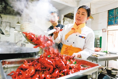 “目前,全县已培育和引进包括於氏龙虾、祥源农业等在内的11家规模以上龙虾深加工企业,年产整肢加工与成品速冻龙虾2万余吨。”龚成介绍,近几年,盱眙县狠抓外引内培,深化与头部企业合作,培育壮大本土小龙虾融合发展企业。许记味食等30余家企业年产龙虾调料1万吨;金康达等企业年产龙虾养殖饲料10万吨;龙虾产业集团和叮咚买菜合作打造盱眙龙虾超级加工厂,每天以“拳击虾”为主的销售额约100万元。
