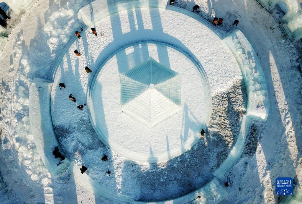 12月14日,工人在哈尔滨冰雪大世界园区建设现场施工(无人机照片)。