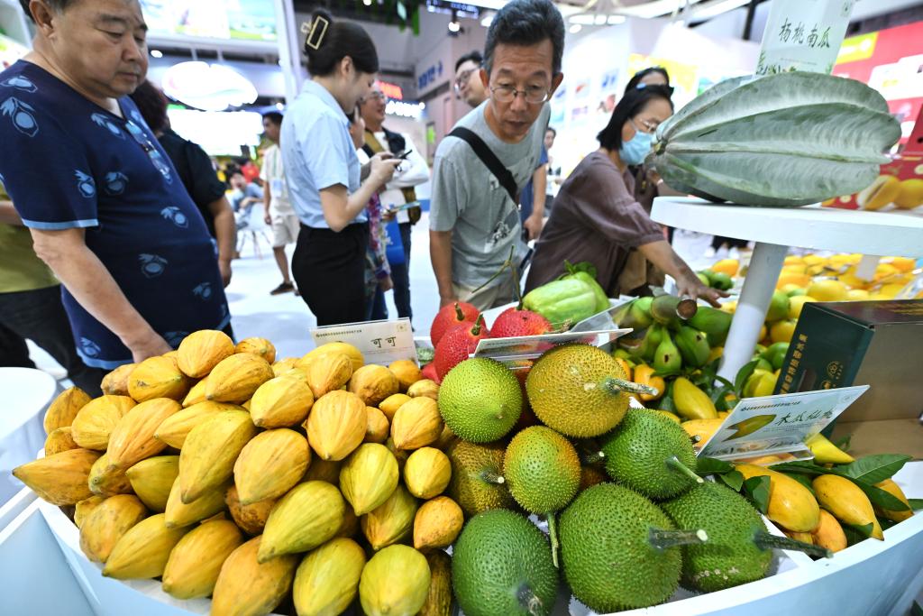12月14日,观众在展会现场观看从国外引进、在海南种植的热带水果。新华社记者郭程 摄
