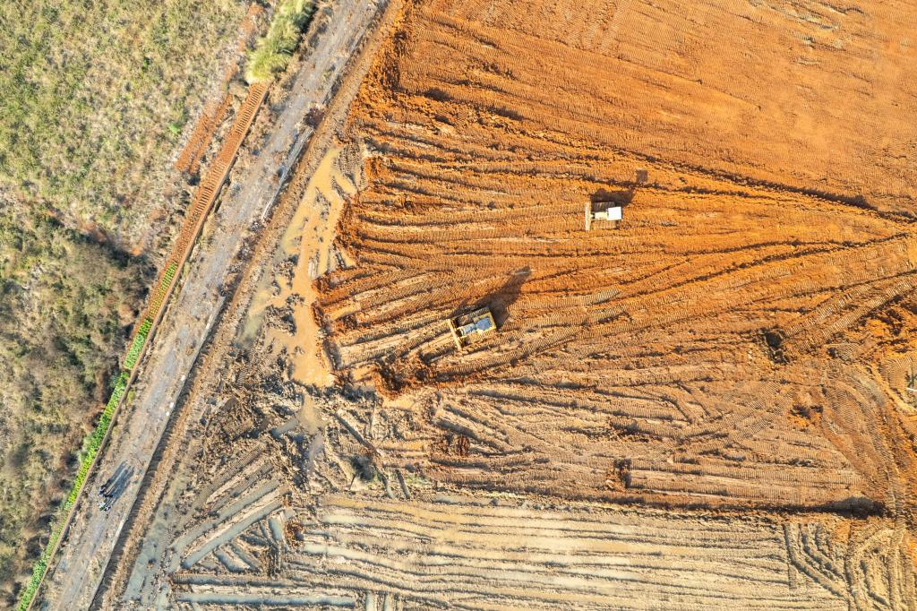 图为在湖南省永州市冷水滩区伊塘镇庙山村,施工人员在进行高标准农田建设施工(无人机照片)。新华社记者 陈思汗 摄