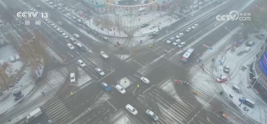 在山东德州,从昨天上午开始,雪花漫天飞舞,一些路面出现积雪。交警部门在易积雪、结冰路段设置警力,疏导交通。