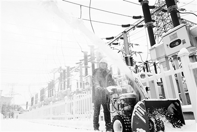 为应对近期大范围寒潮和低温雨雪冰冻天气,国网本溪供电公司员工在变电站进行除雪作业供图/新华社