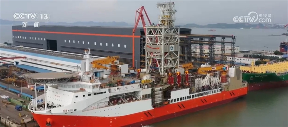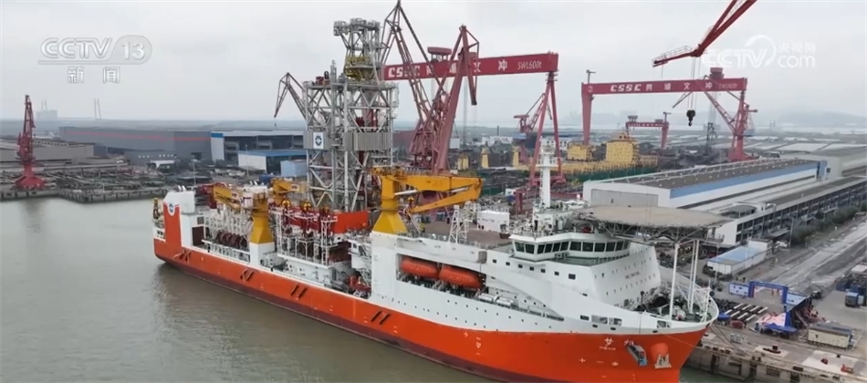总台央视记者 吴天白:在我身后的就是今天正式命名为“梦想”号的超深水大洋钻探船。“梦想”号总吨为33000吨、总长179.8米、宽32.8米,续航力15000海里,可以连续在海上工作120天,是全球唯一一艘具备11000米钻探能力的科考钻探船。