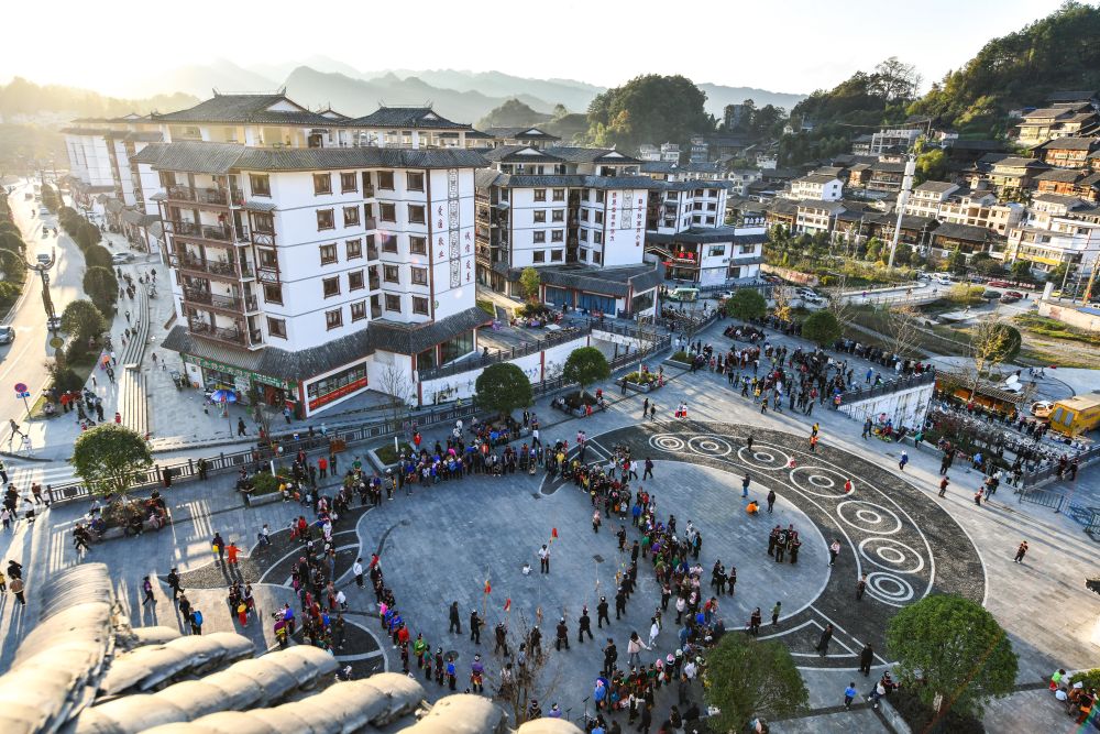在贵州省雷山县龙头街道一处易地扶贫搬迁安置点,村民和游客在苗年活动中跳芦笙舞(2020年11月19日摄)。新华社记者 杨文斌 摄