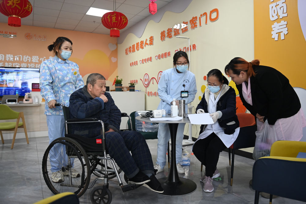 在浙江省慈溪市白沙路街道居家养老服务中心,81岁老人吴森泉(左二)在接受免费助浴服务前进行身体状况检查(2023年11月19日摄)。新华社记者 黄宗治 摄
