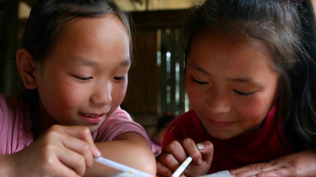 2010年5月27日,在乌英教学点,二年级学生潘木枝(左)在课堂上学习。