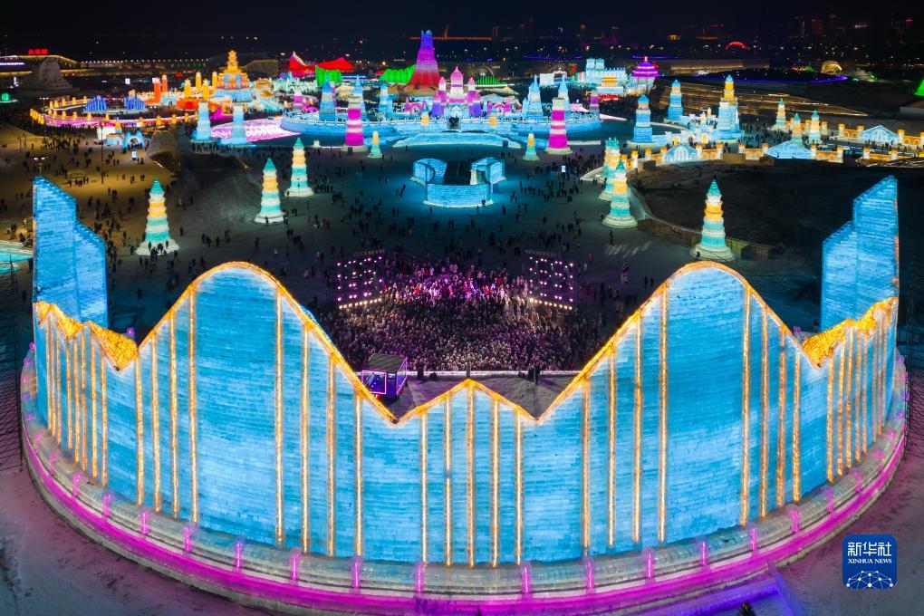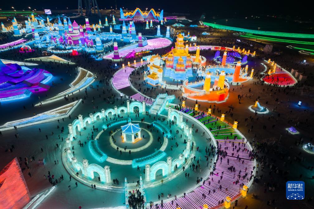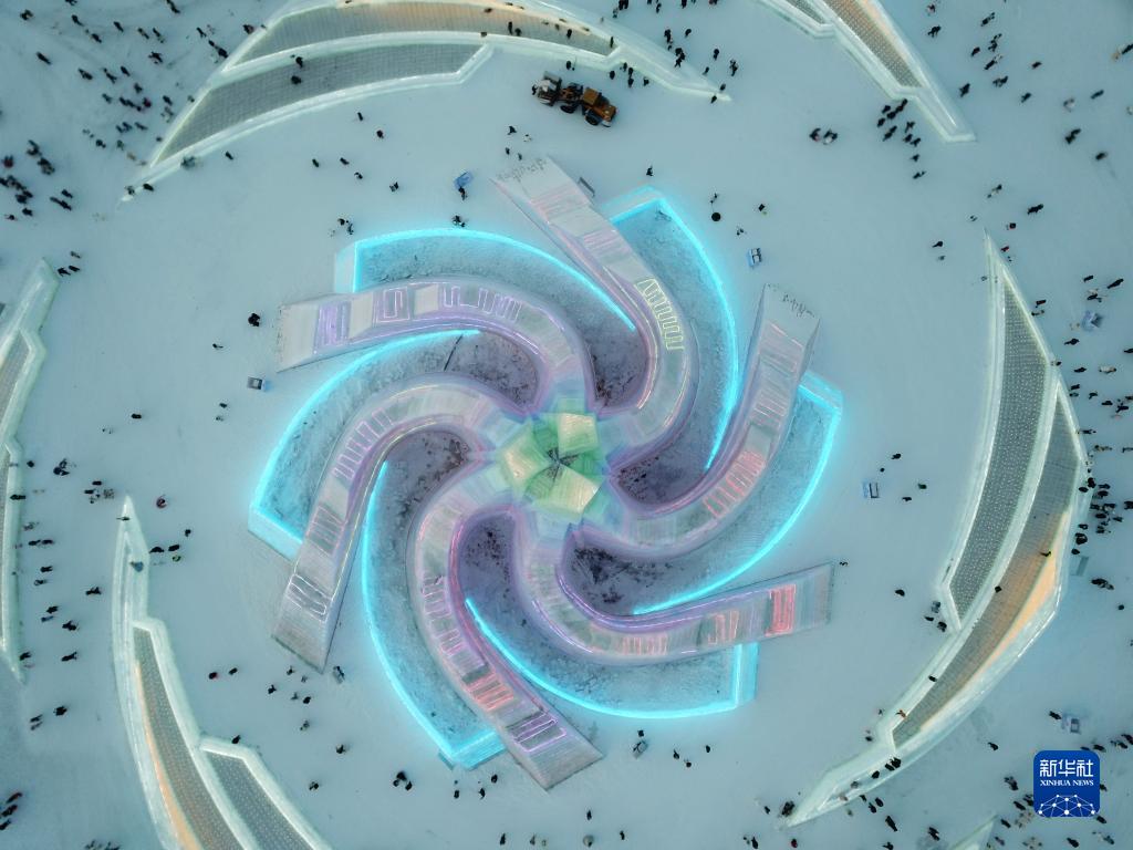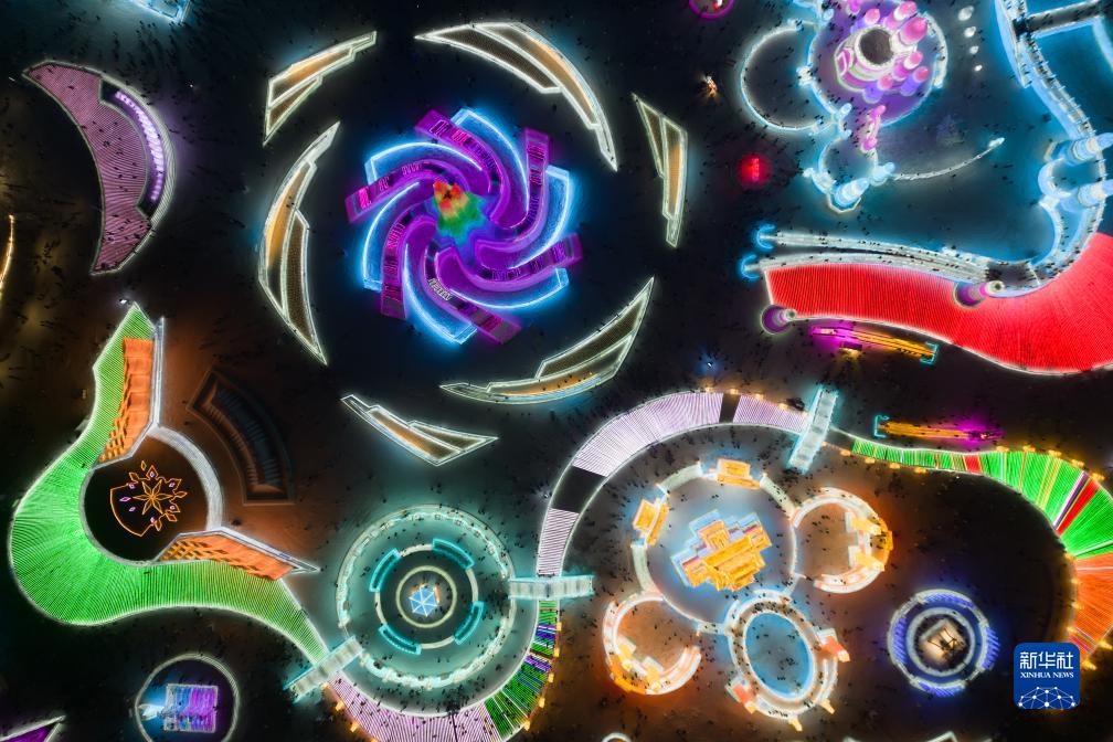 12月18日,游客在哈尔滨冰雪大世界园区内游玩(无人机照片)。新华社记者 谢剑飞 摄