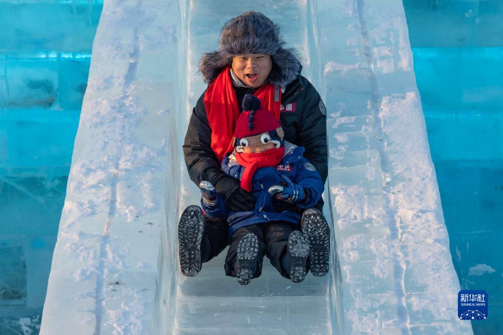 12月18日,在哈尔滨冰雪大世界园区,游客在体验冰滑梯。新华社记者 谢剑飞 摄