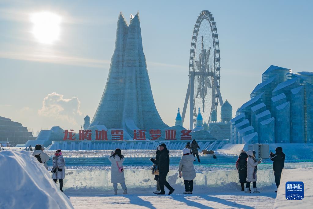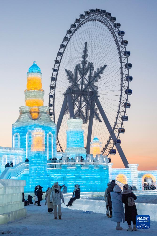12月18日,游客在哈尔滨冰雪大世界园区内的“雪花摩天轮”附近游玩。新华社记者 谢剑飞 摄