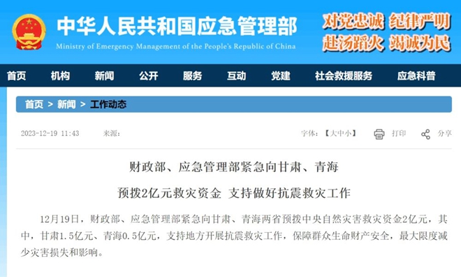 来源标题:财政部、应急管理部紧急向甘肃、青海预拨2亿元救灾资金