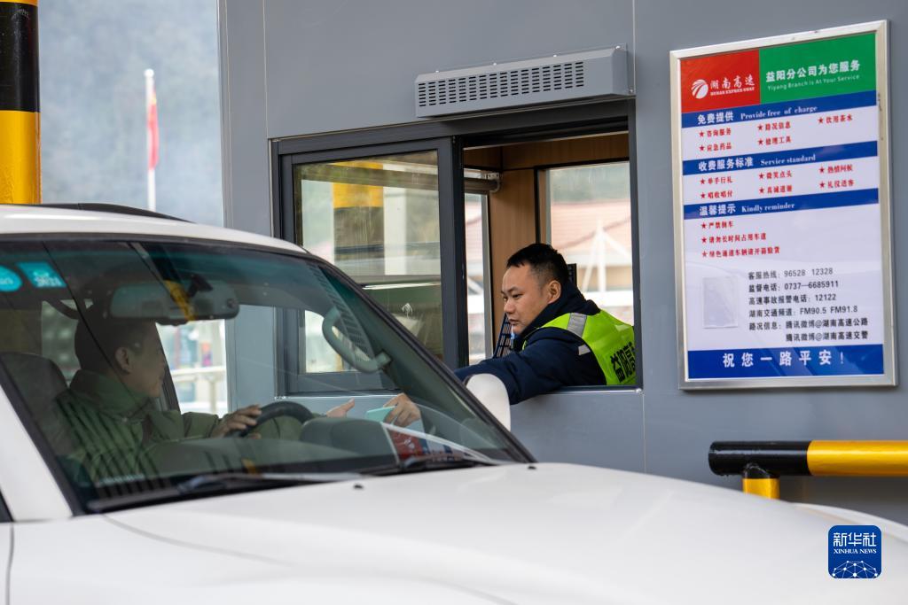 12月19日,在官新高速安化西收费站,工作人员向司机发放车辆通行卡。新华社记者 陈思汗 摄