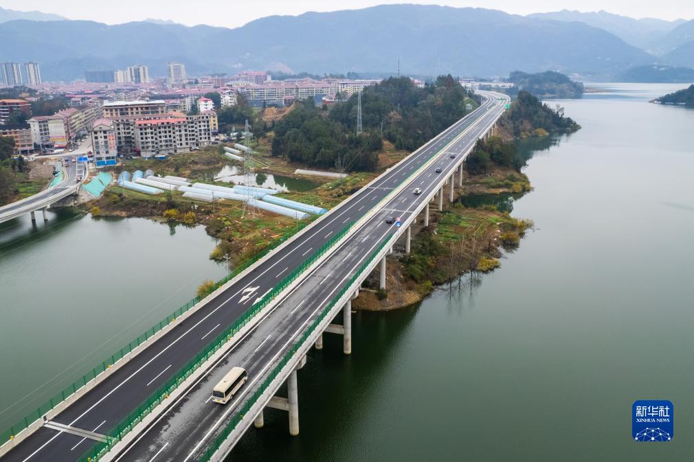 12月19日,车辆行驶在官新高速杨家湾大桥上(无人机照片)。新华社记者 陈思汗 摄
