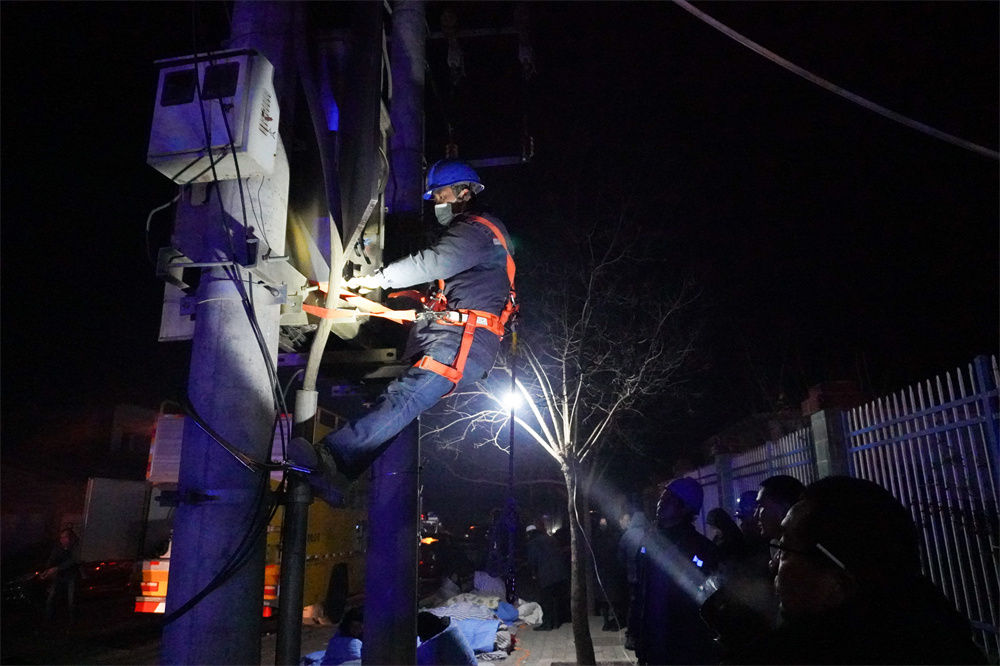 12月19日,在甘肃省临夏回族自治州积石山保安族东乡族撒拉族自治县中西医结合医院门口,电力部门工作人员抢修电力设施。新华社记者 马希平 摄