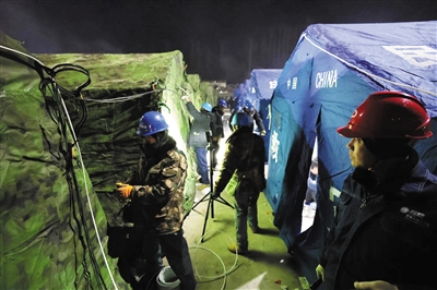在积石山县大河家镇临时安置点,救援人员已经搭建了160多顶救灾帐篷。此外,解放军、消防人员、电力工人等救援人员还在彻夜忙碌,为群众搬运、分发物资,帮助灾区人民尽快渡过难关。中铁二十一局四公司总经理祁涛介绍说:“在大河家镇梅坡村,我们紧急修建了36间集装箱式彩钢板房,可以安置200多名受灾群众。目前,中铁二十一局调集100余人,在村广场、梅坡村六社和十社,梅坡村党群服务中心搭设活动板房,预计20日晚上将完成160间,配套床位、被褥和火炉等必备物品。”