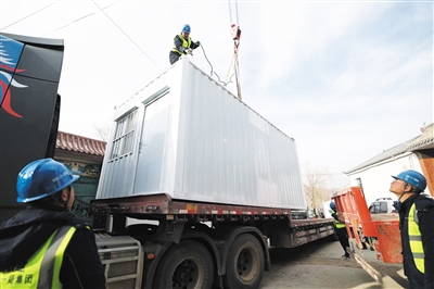 12月20日,大河家镇梅坡村,中铁二十一局施工人员正在用吊车将集装箱式彩钢板房运到指定安置点。