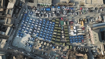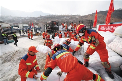 12月20日,大河家镇梅坡村委会安置点,消防人员正在搬运抵达的过冬物资。