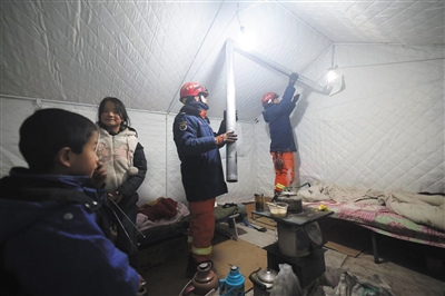 12月20日,大河家镇安置点,消防人员正在刚搭建的帐篷内安装煤炉。