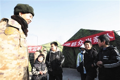 不时会有小朋友跑到解放军面前,打量着这些身穿军装的叔叔,与他们交流。孩子们都说解放军叔叔很帅。摄影/新京报记者 王飞