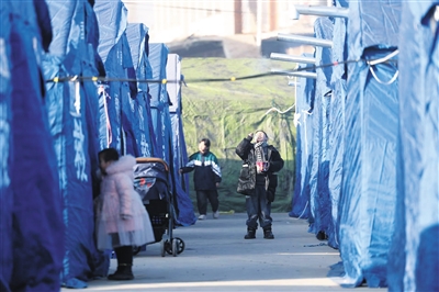 大河家镇安置点建在一处居民活动广场上,旁边有不少健身娱乐设施。一群孩子在此玩耍,孩子们的欢声笑语在安置点传开。很多留在安置点的家长也在围观孩子们做游戏,“孩子们的笑声一响起来,整个安置点的气氛都会轻松很多。”