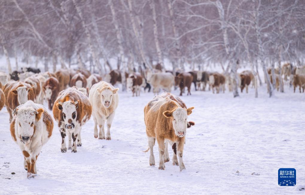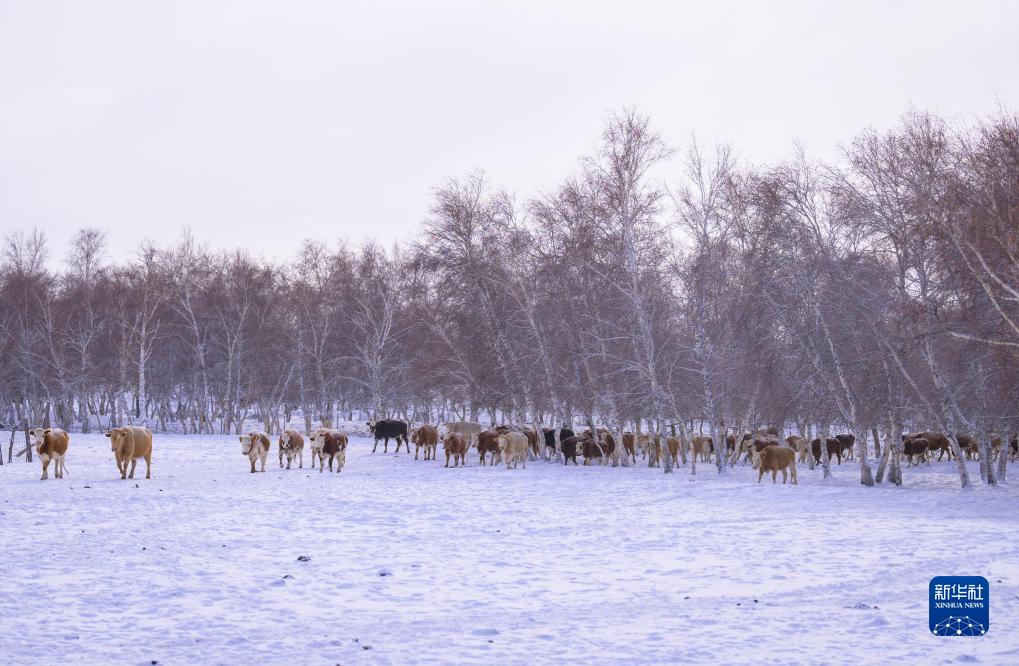 12月20日,牛群在西乌珠穆沁旗草原上的树林间觅食。新华社记者 彭源 摄