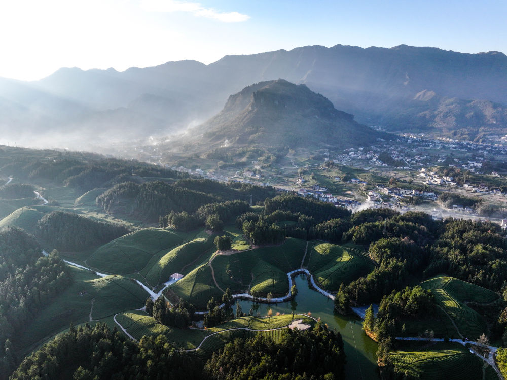 2023年12月5日拍摄的湖北省鹤峰县走马镇杨柳池茶园风光(无人机照片)。