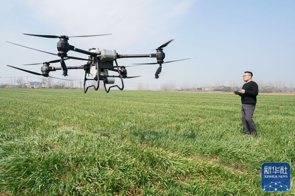 2023年2月28日,王昌在来安县水口镇拥巷村操作植保无人机喷洒除草剂。