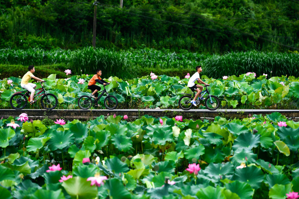 孩子们在贵州省岑巩县客楼镇下寨村骑行游玩(8月2日摄)。