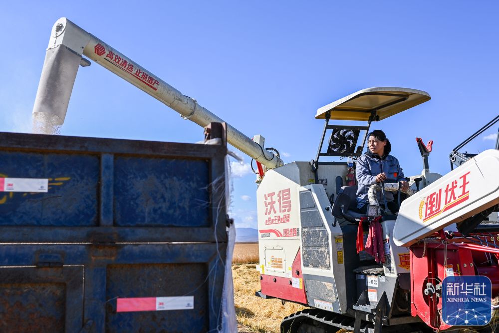 2023年10月20日,“80”后刘春艳在珲春市三家子满族乡东岗子村的水稻田里驾驶收割机收割水稻。
