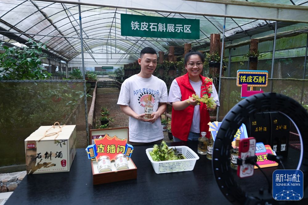 2023年6月8日,在诸暨市东白湖镇的铁皮石斛有机种植基地,基地负责人孙思宝(左)和志愿者一起直播卖铁皮石斛花茶、铁皮石斛酒等产品。