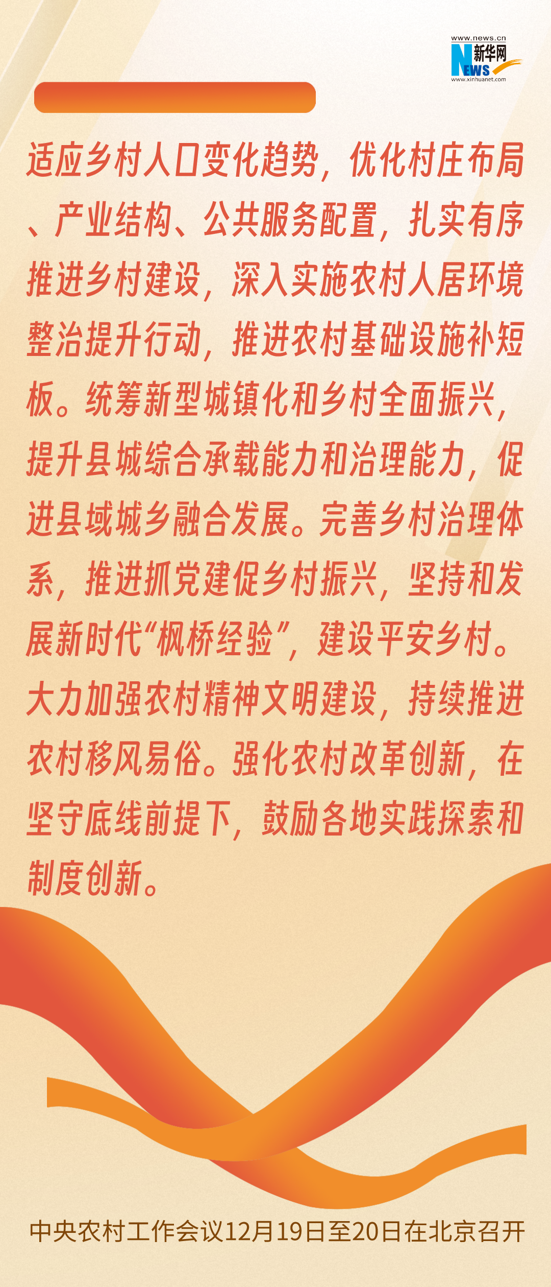 “坚持产业兴农、质量兴农、绿色兴农”“精准务实培育乡村产业”“优化村庄布局、产业结构、公共服务配置”“扎实有序推进乡村建设”“深入实施农村人居环境整治提升行动”“统筹新型城镇化和乡村全面振兴”“推进抓党建促乡村振兴”“持续推进农村移风易俗”......围绕全面推进乡村振兴,会议作出重要部署。