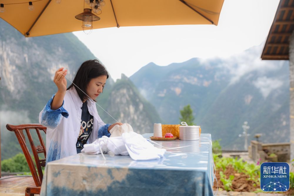 2023年10月10日,在重庆市巫山县竹贤乡下庄村,31岁的袁孝鑫在创作扎染图案。