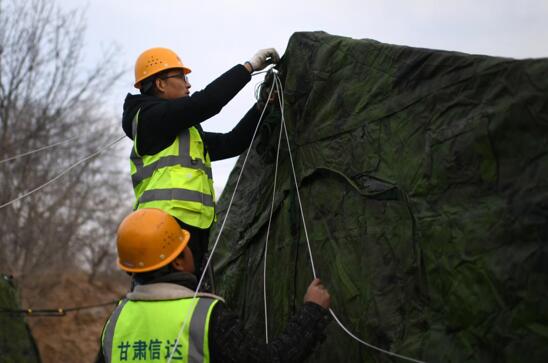 12月20日,在积石山县大河家镇大河村安置点,工作人员正在为安置点铺设免费WiFi。人民网记者 翁奇羽摄