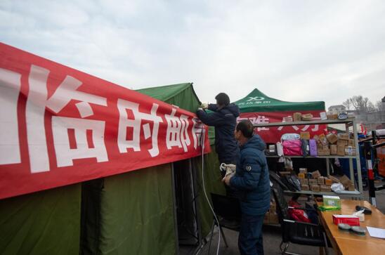 12月20日,在积石山县大河家镇大河村安置点,中国邮政的工作人员正在搭建临时邮局。人民网记者 翁奇羽摄