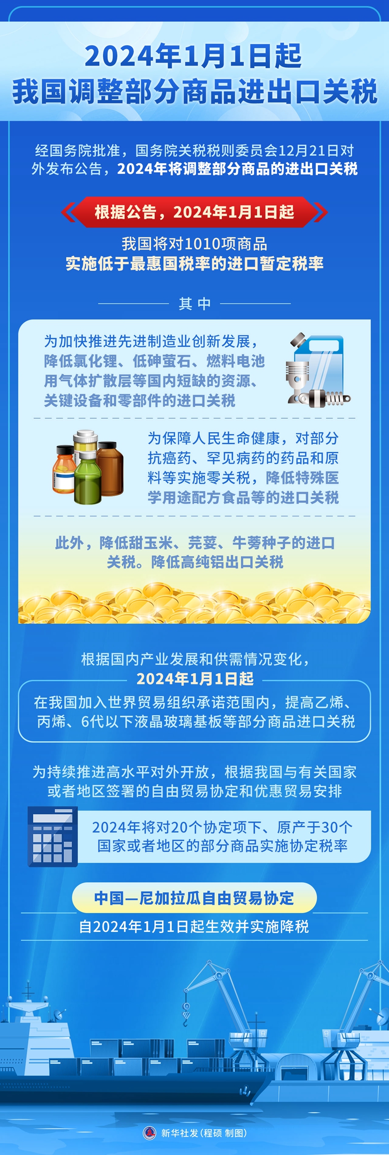 新华社北京12月21日电 经国务院批准,国务院关税税则委员会21日对外发布公告,2024年将调整部分商品的进出口关税。