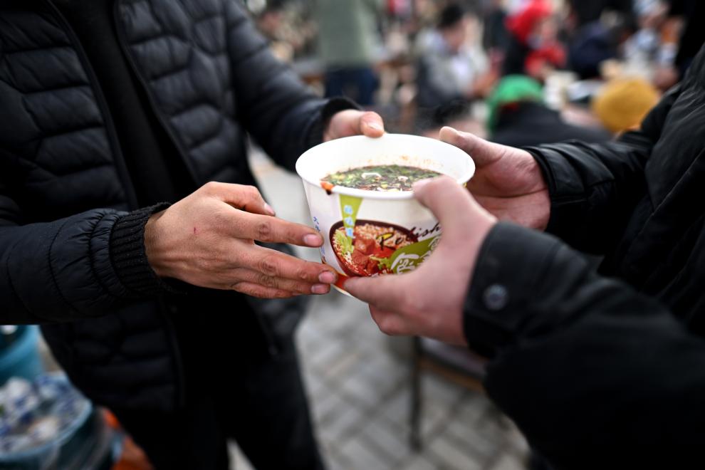 12月20日,在青海省民和县官亭镇,当地群众接过拉面。