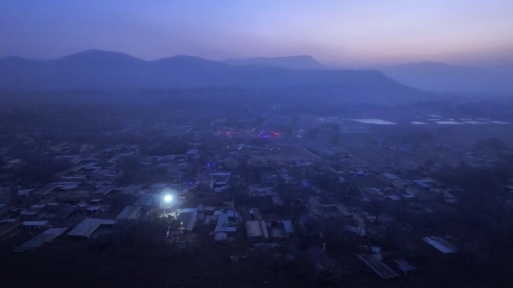 12月19日拍摄的青海省海东市民和回族土族自治县中川乡草滩村一角,海东市消防救援支队队员架起探照灯正在开展救援(无人机照片)。