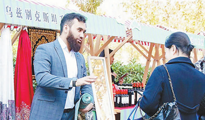 阿森贝克(左)在一场校园活动中介绍乌兹别克斯坦手工艺品。